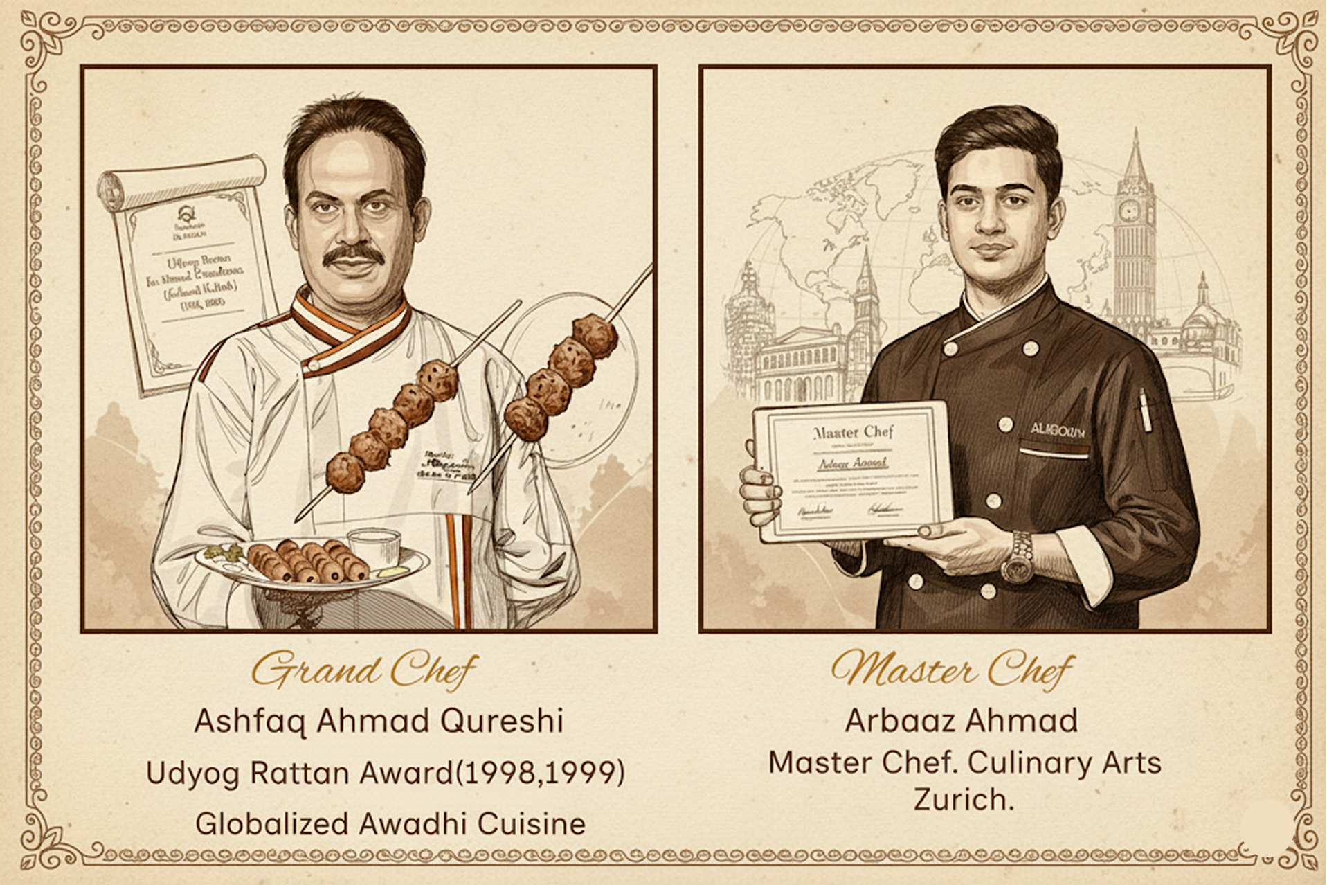Grand Chef Ashfaq Ahmed’s culinary journey began at the age of 10, learning alongside his father, Ishtiaq Ahmed, in the streets of Lucknow. From the very beginning, his passion, dedication, and natural talent stood out. As a testament to his lineage, Ashfaq was entrusted with the secret recipe of the legendary Kakori Kebab—a recipe passed down exclusively to him, preserving the family legacy.